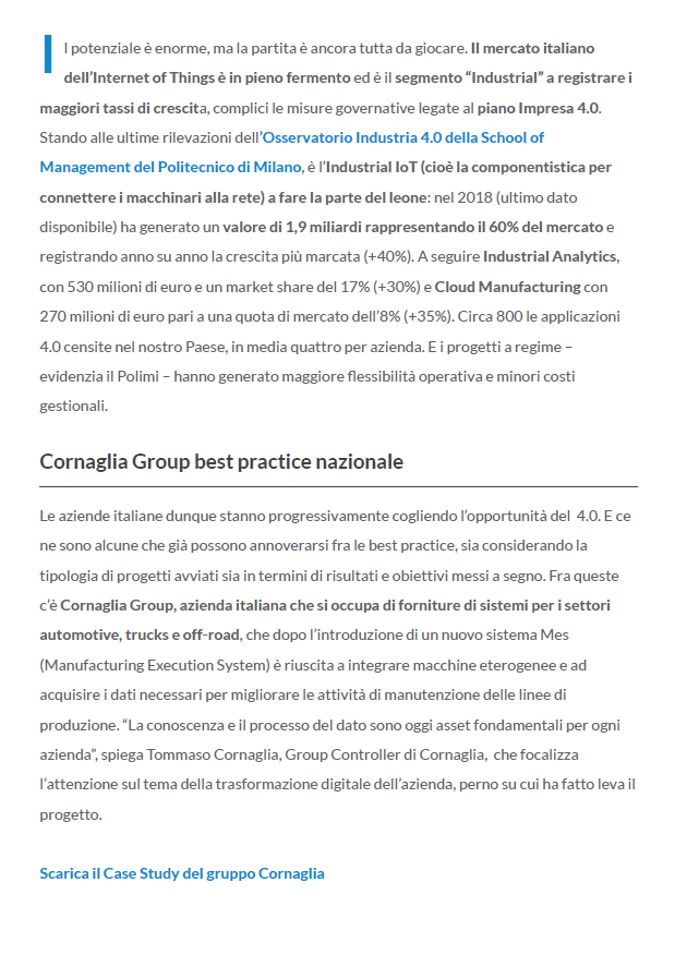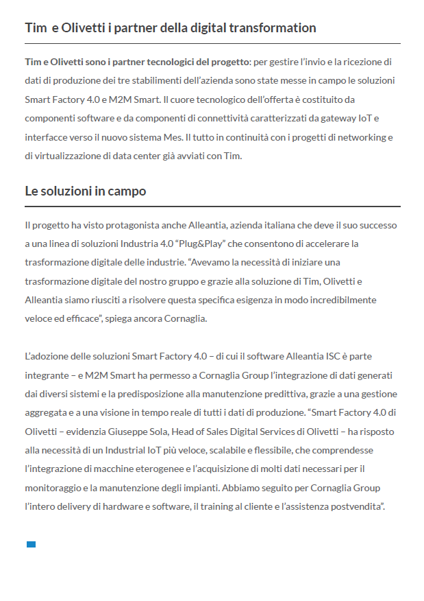 corrierecomunicazioni.it - Industrial IoT, TIM and Olivetti accelerate the digital transformation of Cornaglia Group.